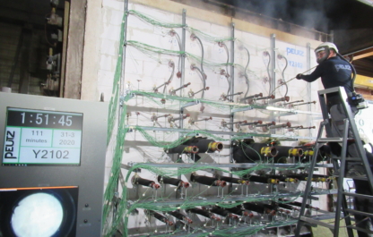 Brandwerendheidstesten worden uitgevoerd met behulp van onze grote of kleine oven (4 x 3 m | 1,5 x 2,5 m). De constructies worden blootgesteld aan een gestandaardiseerde brandkromme (>30 min ruim 800 °C | >60 min bijna 1000 °C). Naast de standaardbrandkromme kunnen ook de buitenbrandkromme en de koolwaterstofcurve (HC-curve) worden toegepast. De testresultaten worden geclassificeerd volgens EN 13501-2.